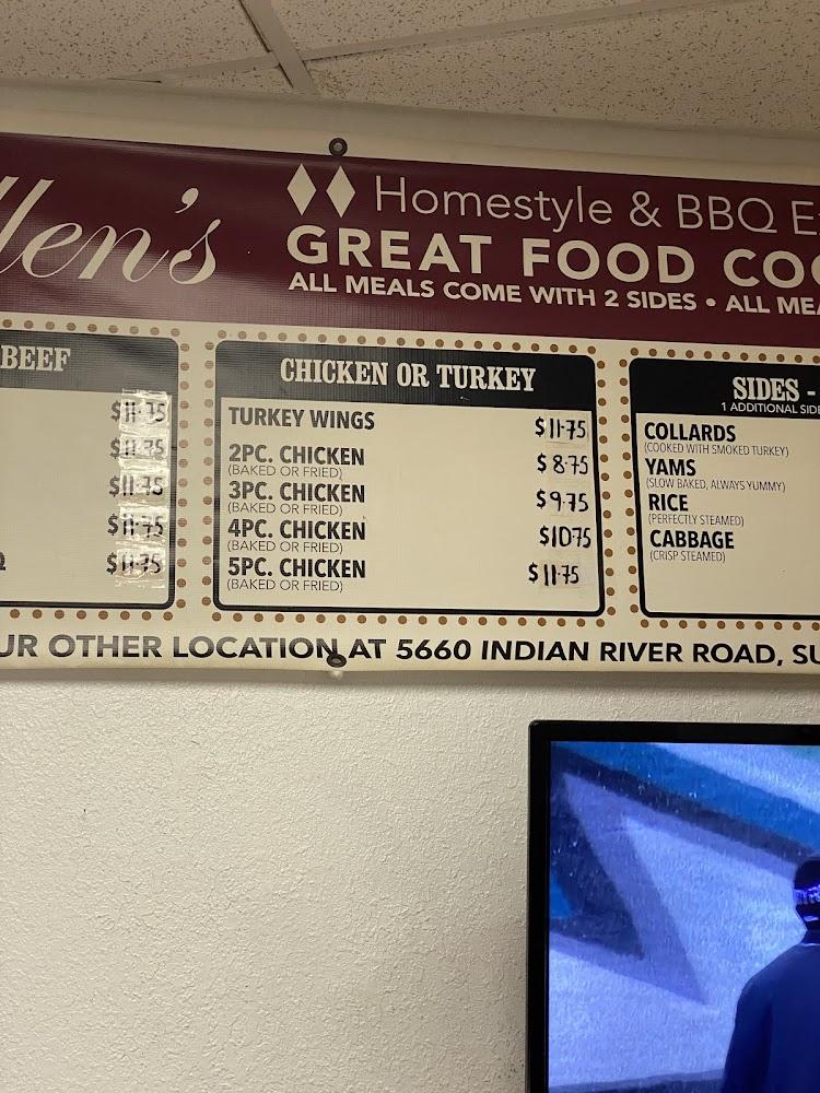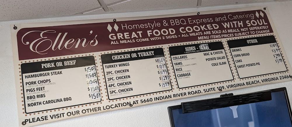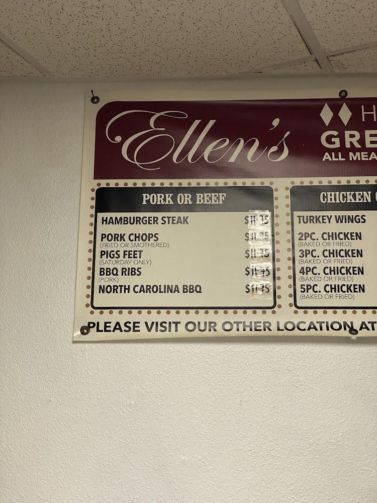 Ellen's menu features beloved comfort food staples. Highlights include BBQ ribs, chicken dishes, and hearty sides like macaroni and cheese. Prices remain wallet-friendly, generally hovering between $10 and $20.